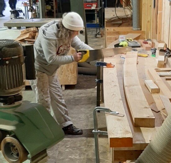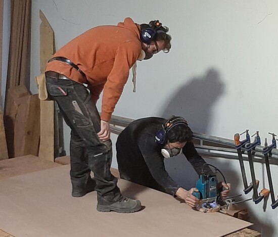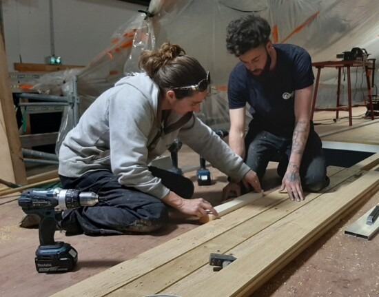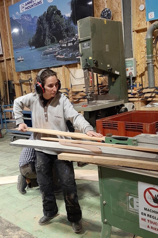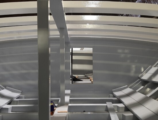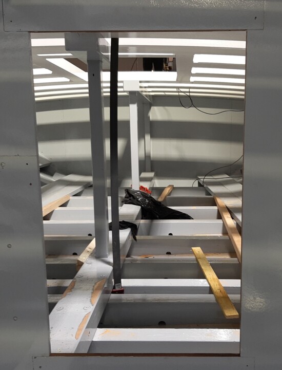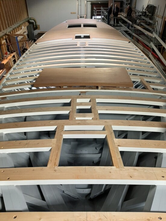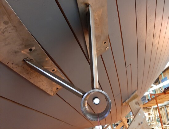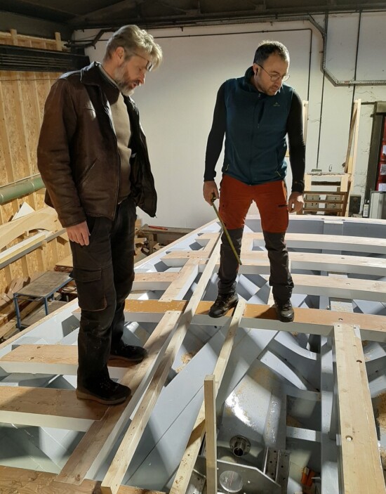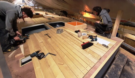 On  vous propose donc un coup de chapeau aux hommes et femme qui, tous les jours, œuvrent sur le chantier : Amaury, Cédric, Célia, Cyril, Hubert, Jérôme, Juliette, Pierre et Valentin. Cette passion communicative qui les animent au quotidien verra son aboutissement lorsque, le mur abattu pour laisser Espérance III quitter le hangar qui l’abrite depuis 18 mois, sa quille entrera au contact de l’eau du lac, aux Marquisats, le 23 juin prochain . Sur les photos  un peu de technique aussi avec les cloisons étanches, les contreplaqués sur barrotage, les chaises d’arbres de transmission, les bancalars, les etambrais avec passage des mats, l’arrivée des moteurs, et le début du lattage de pont en robinier.