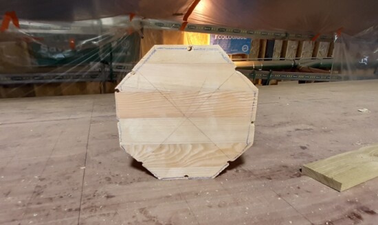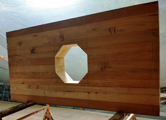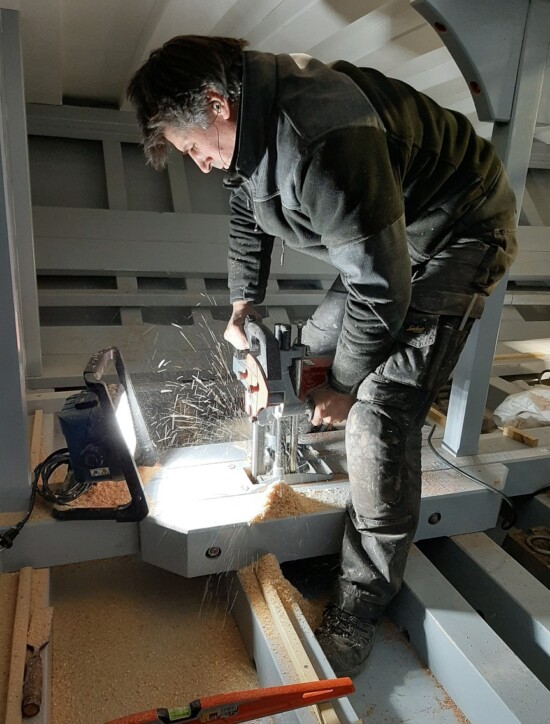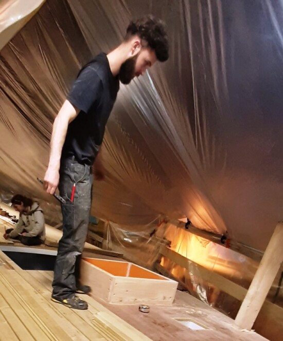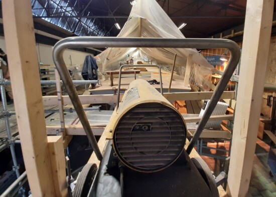 Pour garder une certaine température pour le séchage des peintures ou colles, Espérance III est depuis quelques semaines recouvert d’une « tente de plastique » de moins en moins esthétique au fur et à mesure que les jours passent !